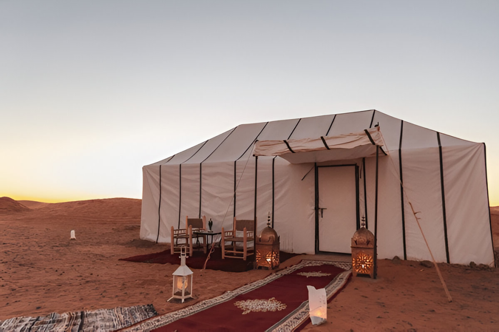 In the evening, you check into a luxury desert camp where comfort meets tradition. The experience includes a delicious Moroccan dinner, live Berber music around the campfire, and a magical night under the stars.